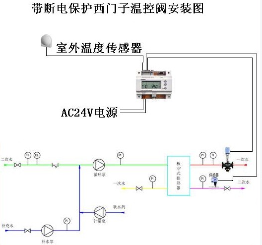 整個係統由室外溫度傳感器、西門子溫度控製器、西門子溫度(dù)調節閥執行器、西門子(zǐ)原裝閥體或同種(zhǒng)參數的國產閥體和傳感器以及循環泵等組成。