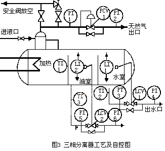 2、自力式(shì)調節閥在河南油田已有十幾年(nián)的使用曆史,已得到了實踐的檢驗(yàn)和成功的(de)應用。典(diǎn)型(xíng)應用:油氣水三相分離器的壓力控製,油室、水室液(yè)位控製(zhì),如圖3所示;除油器壓力、液位控製(zhì),如圖4所示;氣液分離器、緩(huǎn)衝罐(guàn)壓力、液位控製(略);居民區供暖(nuǎn)分支管線的流量、溫度控製等(略)。