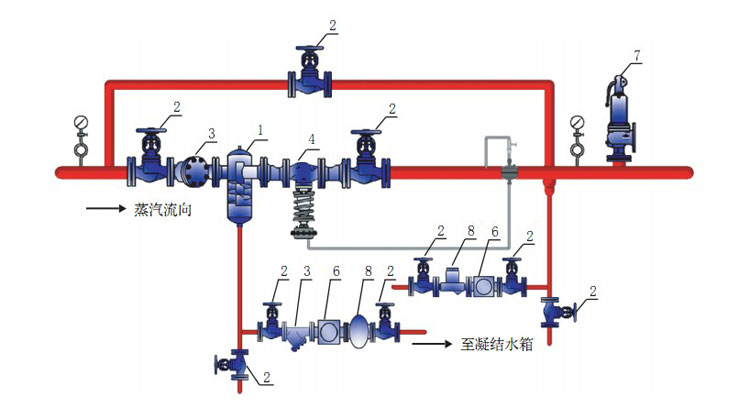 建議在減壓站出口處(chù)安裝管道疏水閥組,當停機時能迅速(sù)排出冷凝水防止形成管道(dào)水錘。