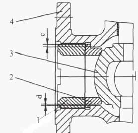 (1)閥座(圖3)采用浮動設計,降低加工難度,保證閥座中心線與半球體球麵中心點重合,從而提高密封性能。閥座與閥體有間(jiān)隙d,裝配時利用(yòng)半球體定位可自動找正(zhèng)中線,保證閥座密(mì)封麵與半球體球麵(miàn)全接觸,解決了(le)因加工精度誤差造成的泄漏,提高了球閥的使用性能及壽命。
