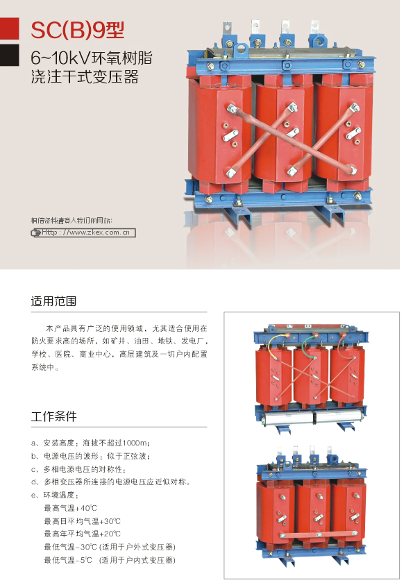 SC(B)9型6-10kv環氧樹脂澆(jiāo)注幹式變(biàn)壓(yā)器具有廣泛的使用領域,尤(yóu)其適(shì)合使(shǐ)用在(zài)防火(huǒ)要求高的場(chǎng)所(suǒ),如礦井、油(yóu)田、地鐵、發電廠.學校、醫院(yuàn)、商業中心,高層建築及-切戶內配置係(xì)統(tǒng)中。