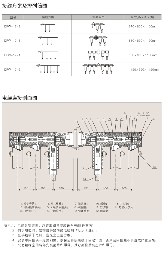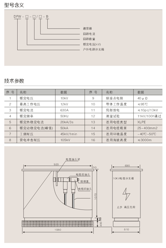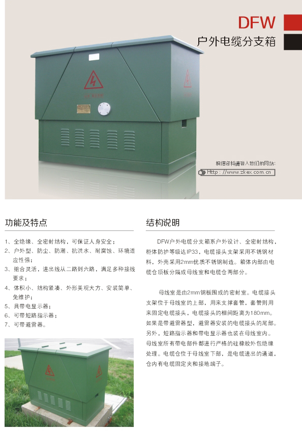 DFW戶外高低壓(yā)電纜分授箱係戶外設計、全密封(fēng)結構,櫃體防護等級達IP33,電纜接頭支架采用不鏽(xiù)鋼材料,外殼采用2mm優(yōu)良不鏽鋼製造。箱體內部由電纜倉頂(dǐng)板分隔(gé)成母線(xiàn)室和電纜倉兩部分。母線(xiàn)室是由2mm鋼板圍成的密(mì)封室。電纜接頭支架(jià)位於母線(xiàn)室的上部(bù),用(yòng)來支撐(chēng)套管,套管則用來固定(dìng)電纜接頭(tóu),電纜接頭的(de)相間距離為180mm。如果是帶避雷器型,避雷器安裝(zhuāng)的電纜接頭的尾…