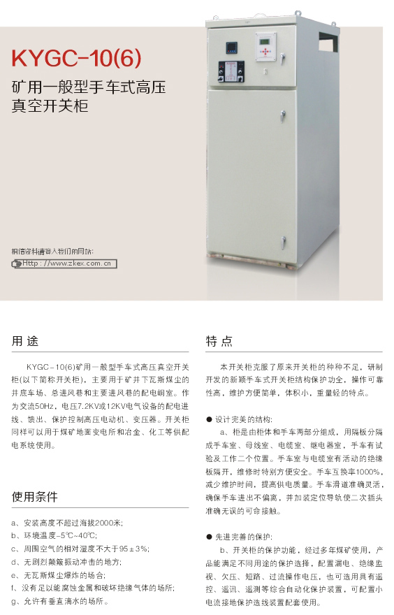 KYGC- 10(6)礦用-般型手車式高壓真空開關櫃(以下簡稱開(kāi)關櫃),主要用於礦井下瓦斯煤塵的井底車場、總進風巷和主要進風巷的配電峒室。作為交流50Hz,電壓7.2KV或12KV電氣設備的配電(diàn)進線、饋出、保(bǎo)護控製高壓電動機、變壓器。開關櫃同樣可以用(yòng)於煤礦地麵變電所和冶金、化工等供配.電係統使用。